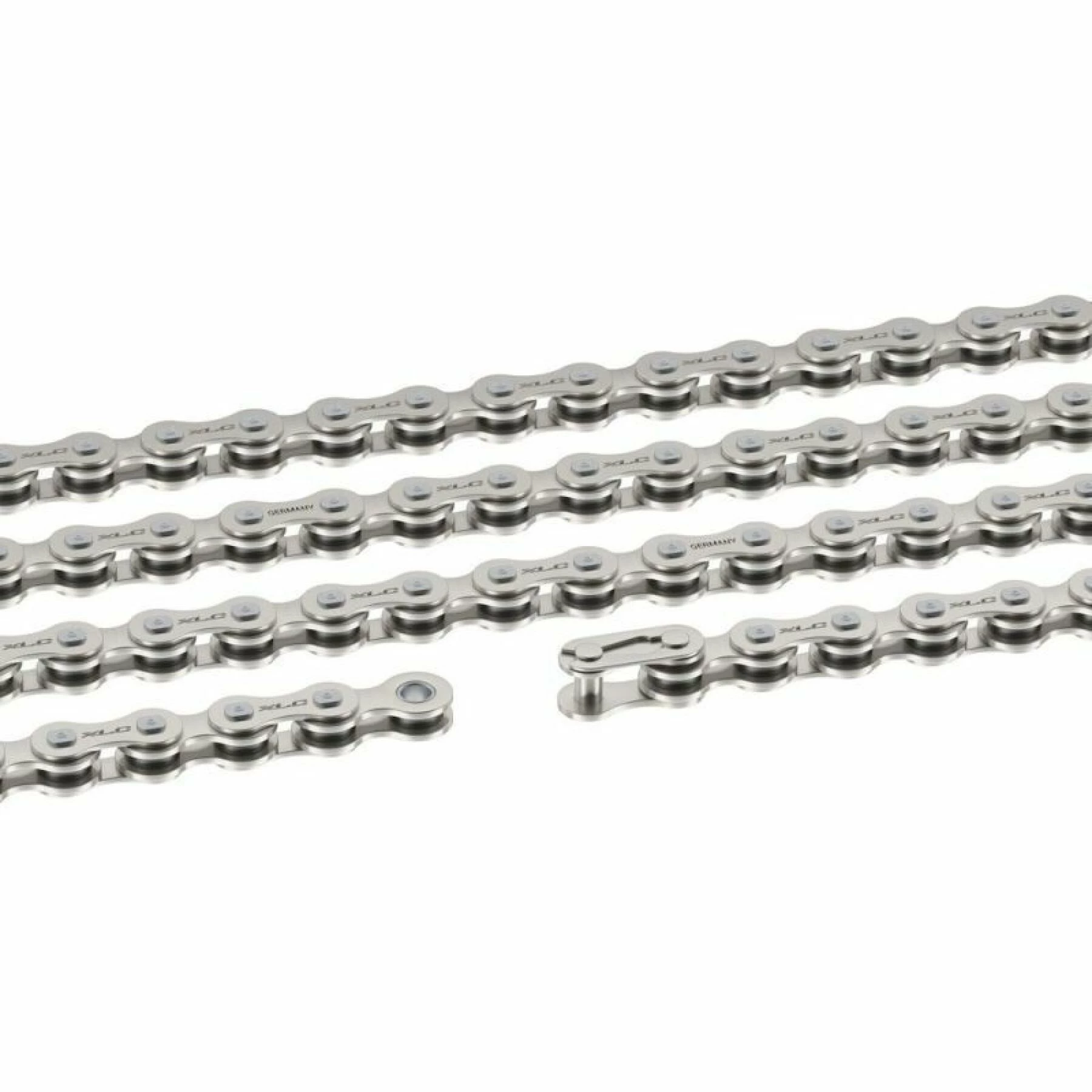 Chaîne XLC CC-C07 patible avec chainglide .longueur boulons: 8,80mm, largeur intérieur: 2,40mm .force d’expulsion de boulon: > 2000N, traité thermiquement .poids: env. 485/513/532g .maillon rapide inclus.
